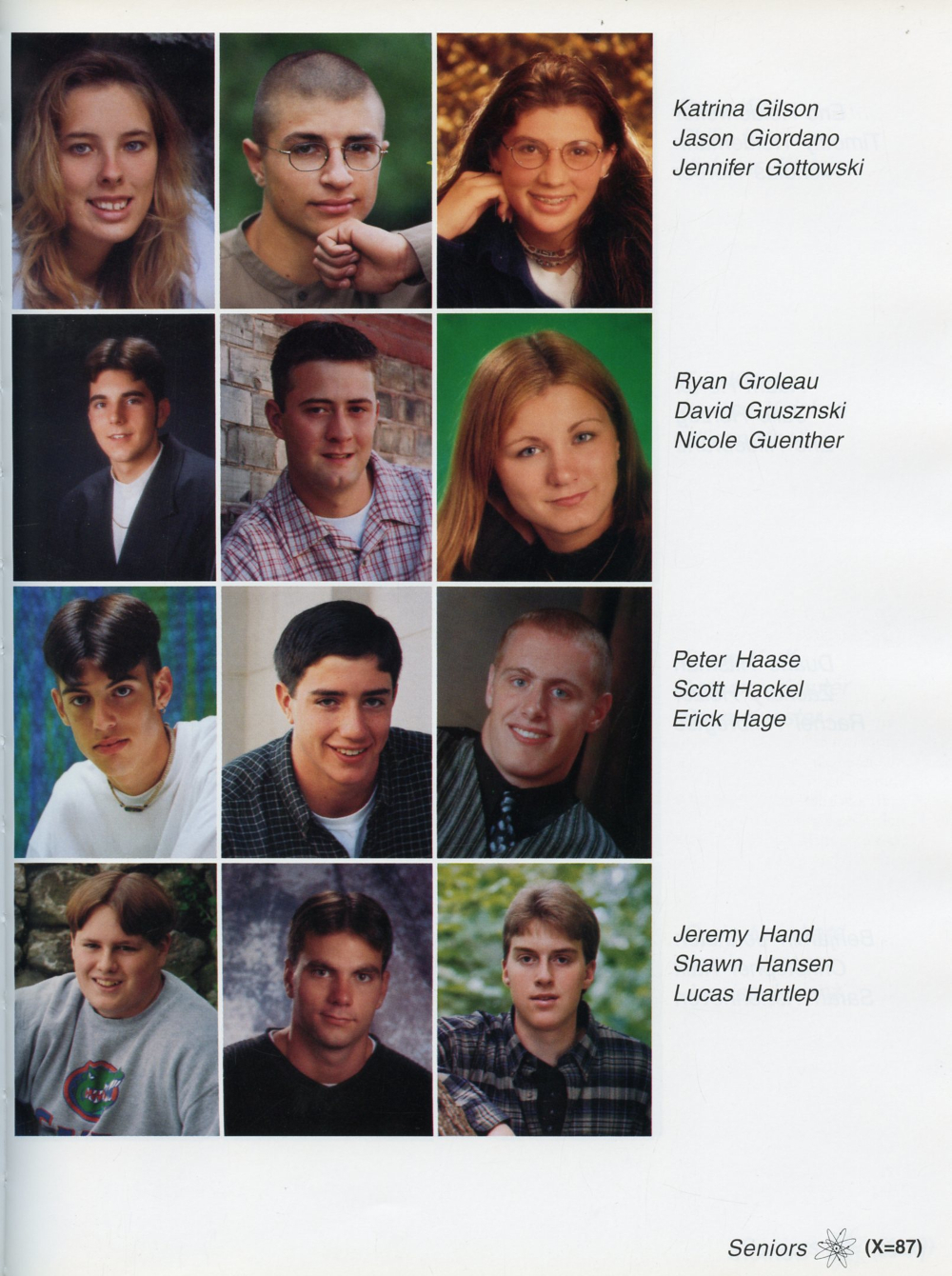 1998 Sheboygan Falls High School Yearbook Page 87: Katrina Gilson, Jason Giordano, Jennifer Gottowski, Ryan Groleau, David Grusznski, Nicole Guenther, Peter Haase, Scott Hackel, Erick Hage, Jeremy Hand, Shawn Hansen, Lucas Hartlep.
