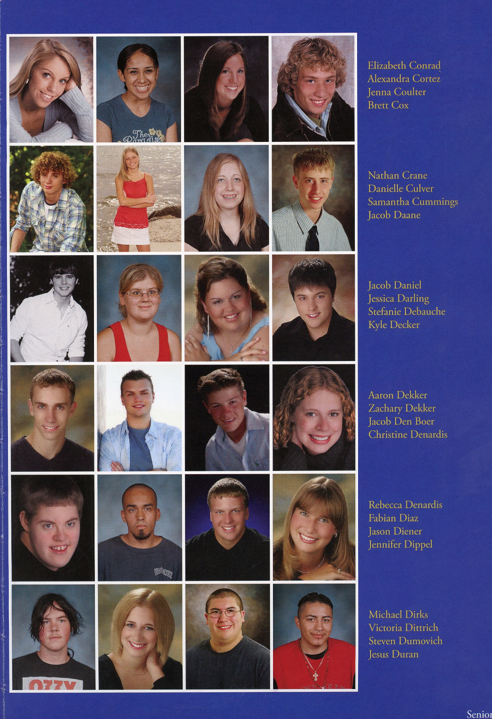 2006 Sheboygan North High School Yearbook Page 117: Elizabeth Conrad, Alexandra Cortez, Jenna Coulter, Brett Cox, Nathan Crane, Danielle Culver, Samantha Cummings, Jacob Daane, Jacob Daniel, Jessica Darling, Stefanie Debauche, Kyle Decker, Aaron Dekker, Zachary Dekker, Jacob Den Boer, Christine Denardis, Rebecca Denardis, Fabian Diaz, Jason Diener, Jennifer Dippel, Michael Dirks, Victoria Dittrich, Steven Dumovich, Jesus Duran.