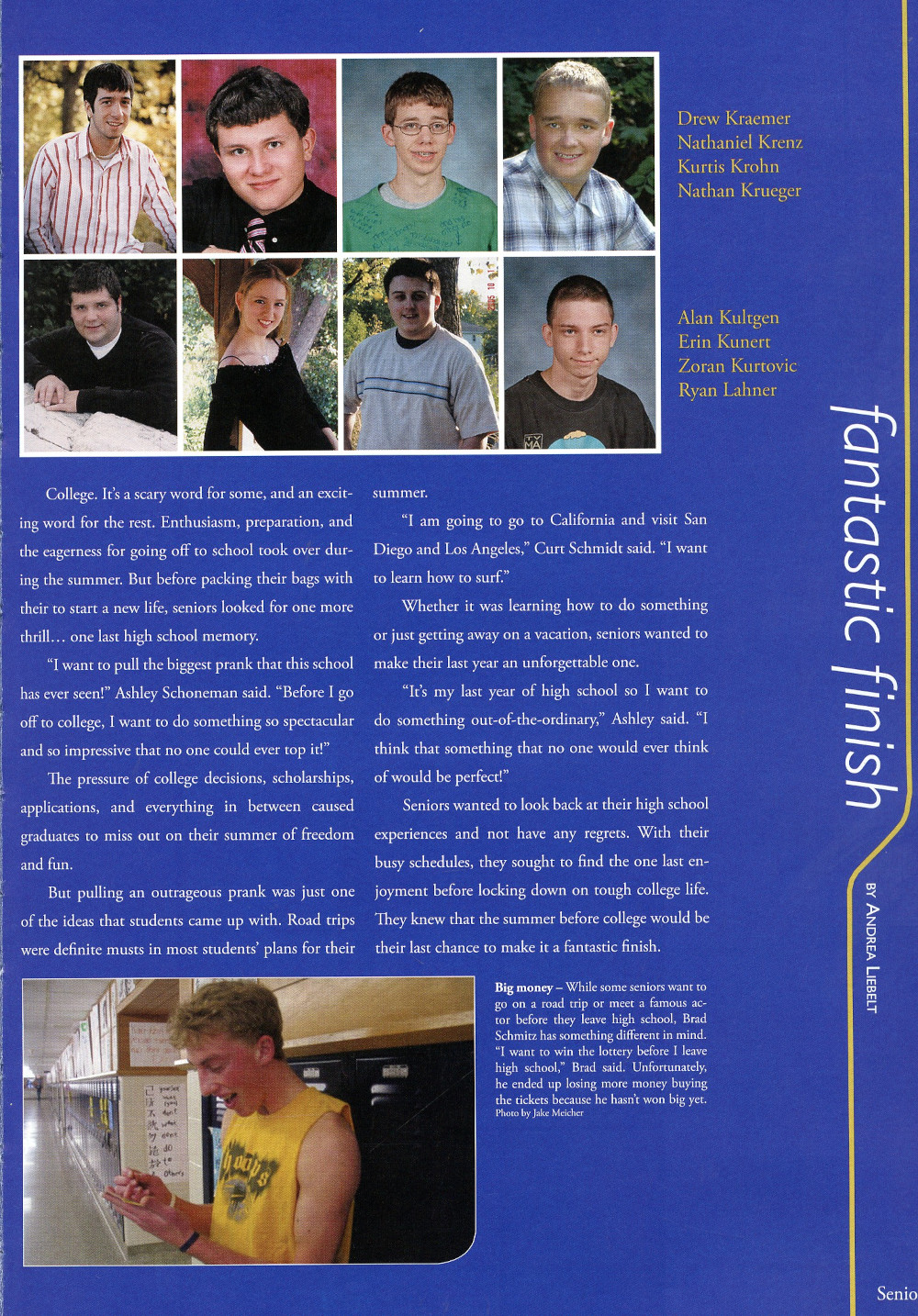 2006 Sheboygan North High School Yearbook Page 123: Drew Kraemer, Nzathaniel Krenz, Kurtis Krohn, Nathan Krueger, Alan Kultgen, Erin Kunert, Zoran Kurtovic, Ryan Lahner.