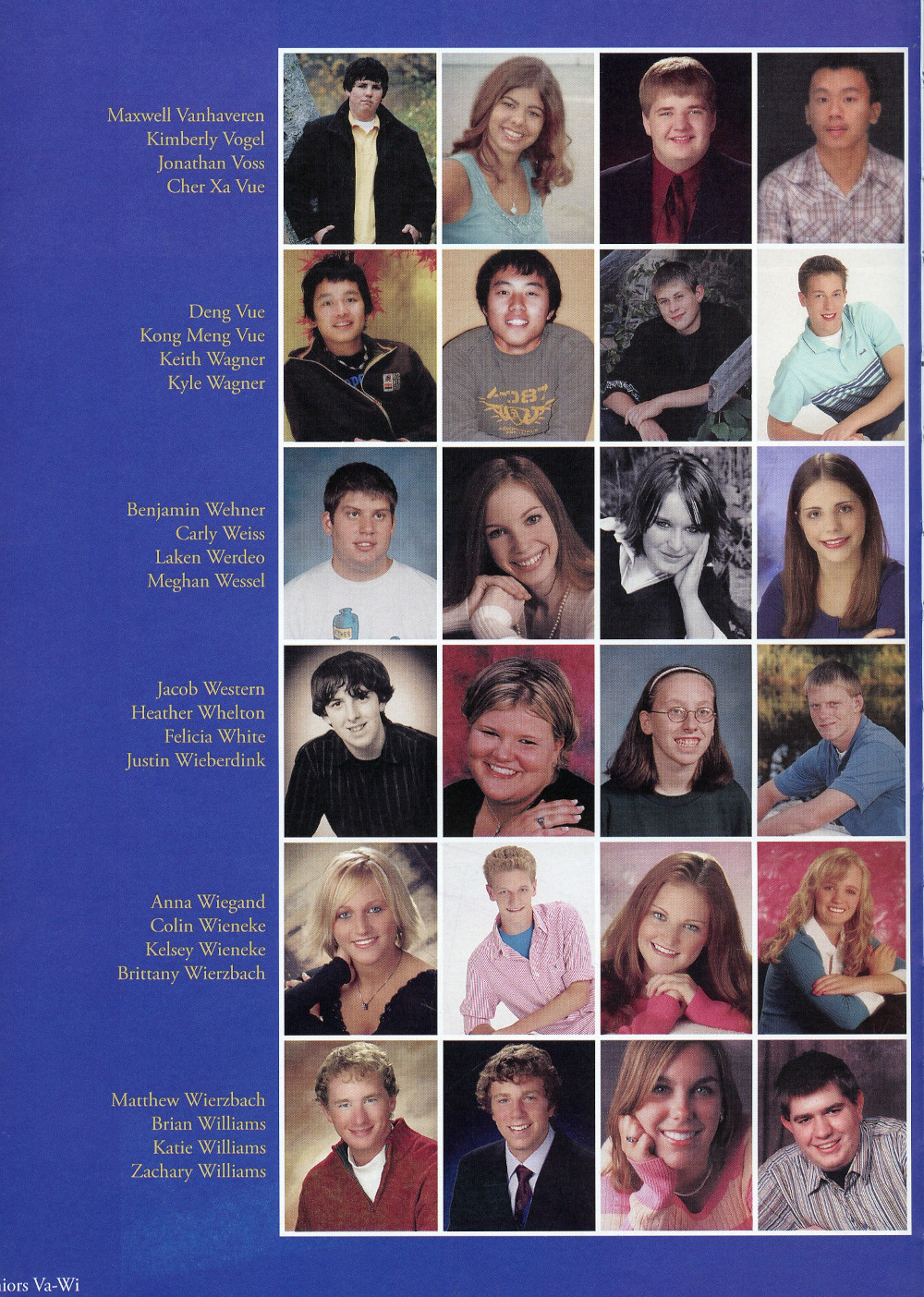 2006 Sheboygan North High School Yearbook Page 134: Maxwell Vanhaveren, Kimberly Vogel, Jonathan Voss, Cher Xa Vue, Deng Vue, Kong Meng Vue, Keith Wagner, Kyle Wagner, Benjamin Wehner, Carly Weiss, Laken Werdeo, Meghan Wessel, Jacob Western, Heather Whelton, Felicia White, Justin Wieberdink, Anna Wiegand, Coloin Wieneke, Kelsey Wieneke, Brittany Wierzbach, Matthew Wierzbach, Brian Williams, Katie Williams, Zachary Williams.