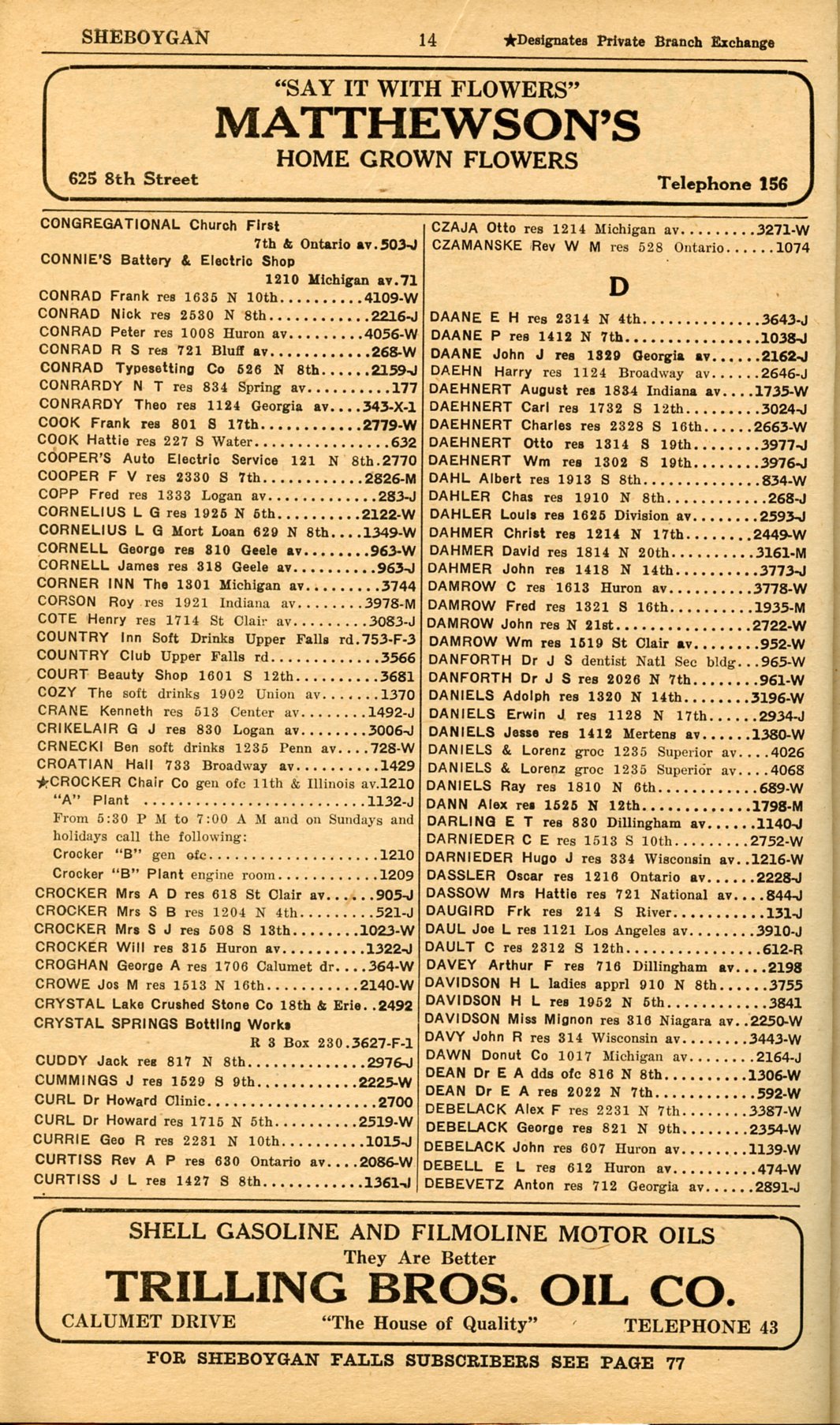 1928 Sheboygan Telephone Book, Page 14: Congregational to Debevetz