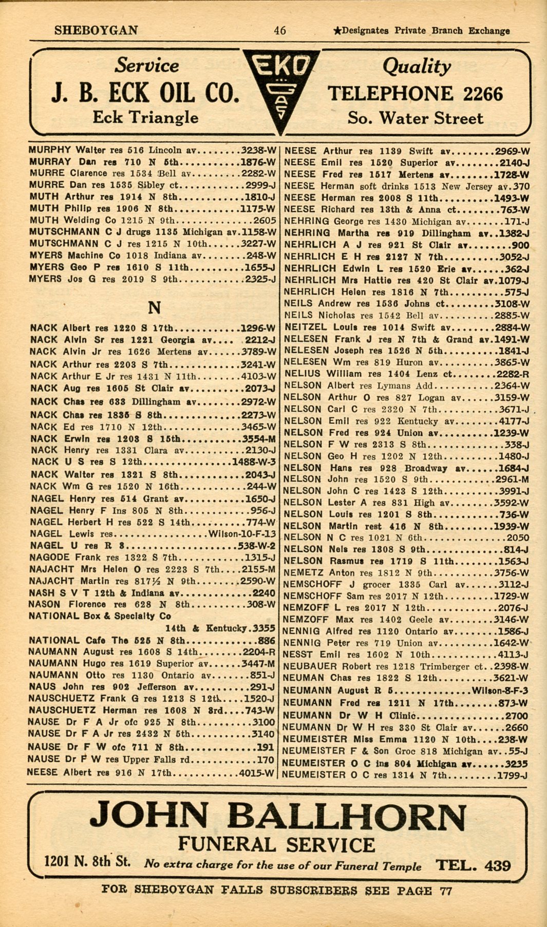 1928 Sheboygan Telephone Book, Page 46: Murphy to Neumeister