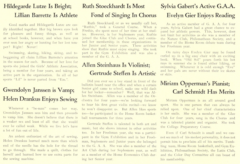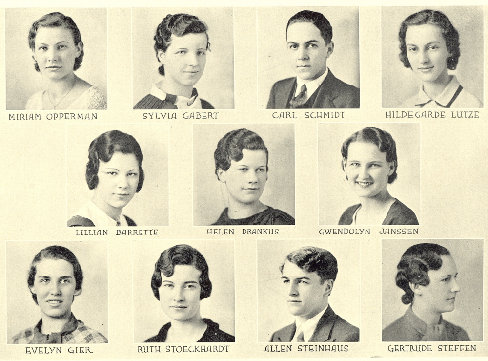 1933 Sheboygan High School, Pages 56 and 57: Mariam Opperman, Sylvia Gabert, Carl Schmidt, Hildegarde Lutze, Lilliam Barrette, Helen Drankus, Gwendolyn Janssen, Evelyn Gier, Ruth Stoeckhardt, Allen Steinhaus, Gertrude Steffen.