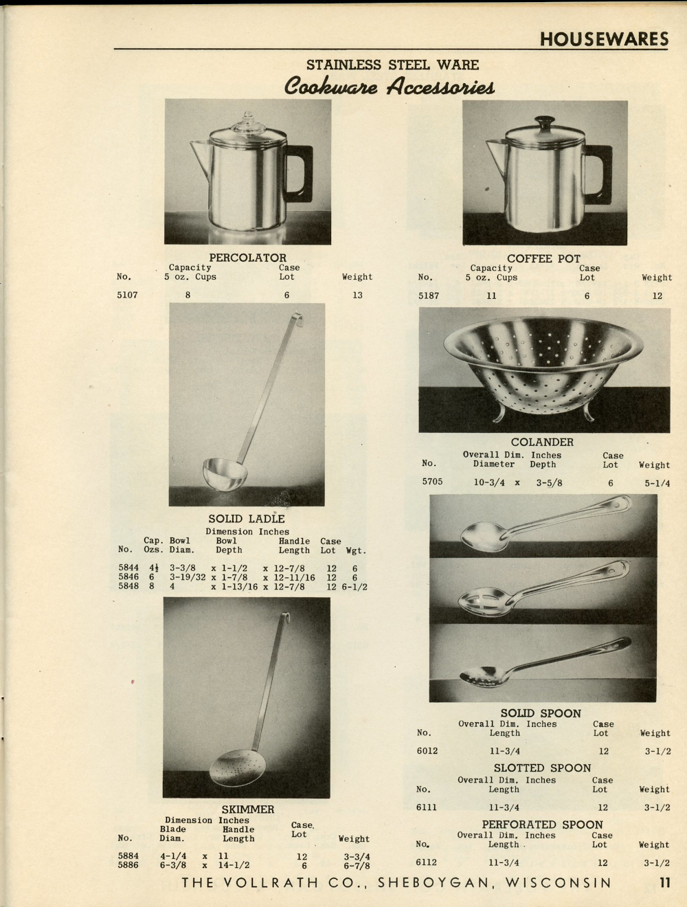 1950 Vollrath Catalog 75R Page 11: Percolator, Coffee Pot, Solid Ladle, Colander, Skimmer, Solid Spoon, Slotted Spoon, Perforated Spoon.