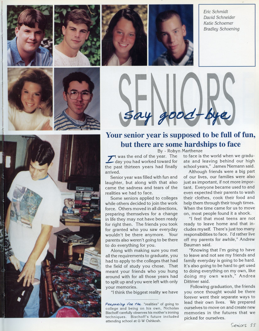 1996 Sheboygan South High School Yearbook Page 55: Eric Schmidt, David Schneider, Katie Schoemer, Bradley Schoening, Nicole Saeger, Jose Sarabia.